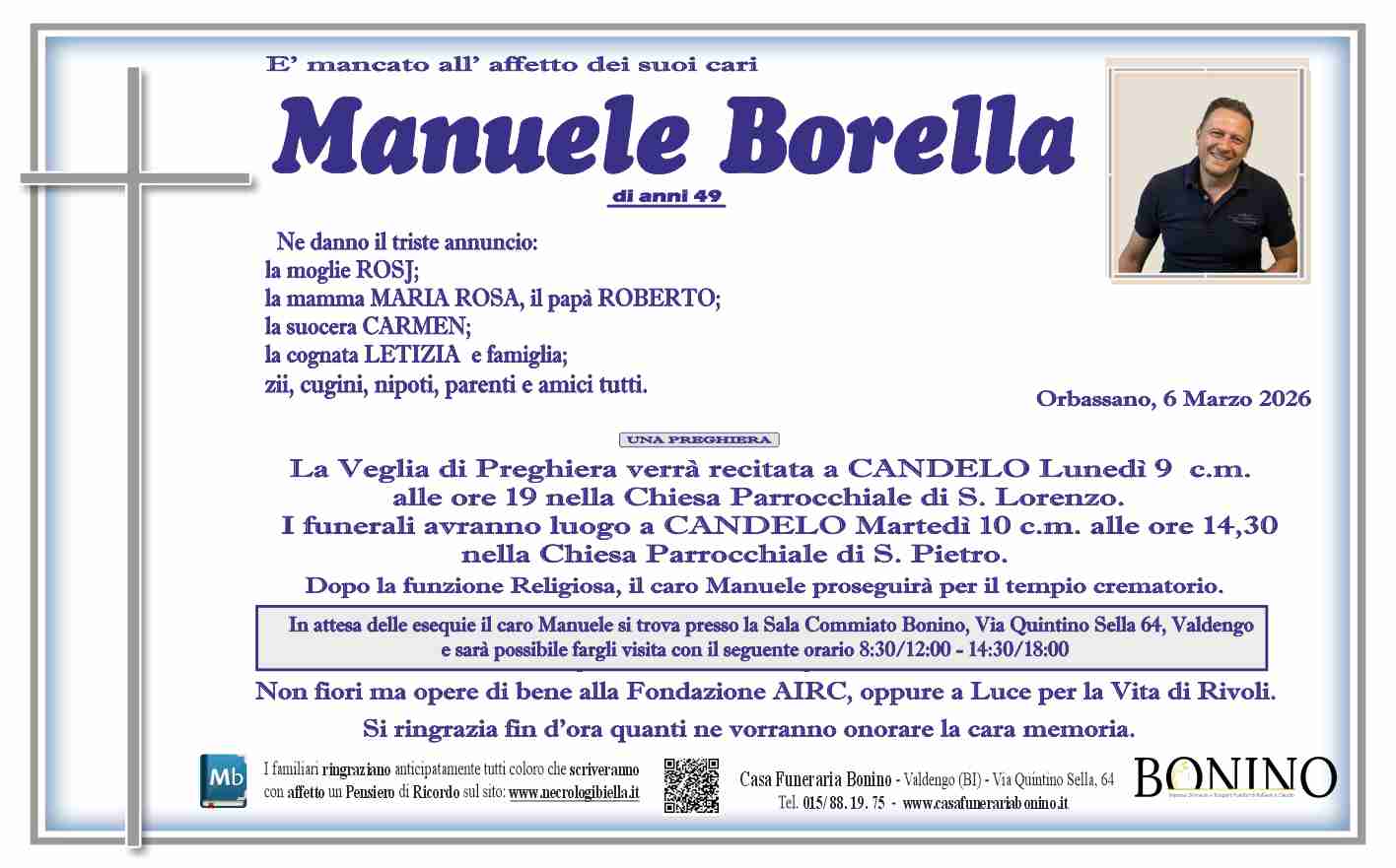 Manuele caro, voglio immaginarti pieno di luce in una nuova dimensione. Il tuo ricordo di persona gentile e buona mi accompagnerà sempre. Dalla luce eterna in cui hai iniziato il tuo nuovo viaggio volgi lo sguardo su questa terra e continua ad accompagnare con il tuo infinito amore tutti quelli che ti hanno conosciuto e ti hanno voluto bene. Grazie per avermi concesso il privilegio di starti accanto nel momento più difficile. Mancherai anima bella💞