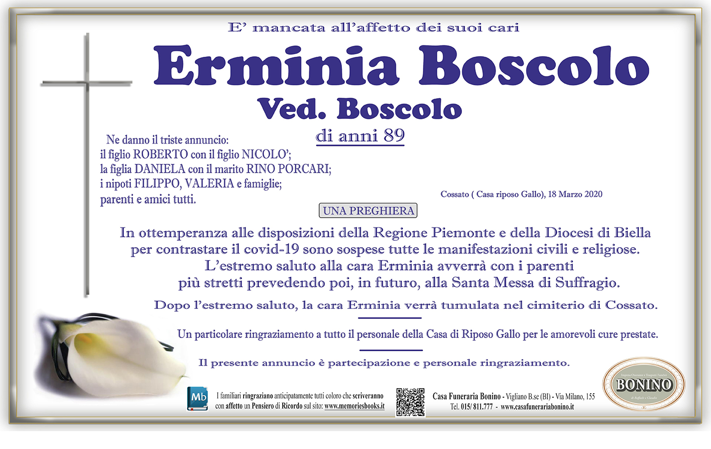 Mi dispiace tantissimo per la Vostra perdita, ricordando con immutato affetto zia Erminia anche se in realtà non lo era. Il suo sorriso e le sue intelligenti pillole di saggezza resteranno sempre nei miei pensieri. Le più sentite condoglianze da Sottomarina. Un abbraccio a tutti i familiari